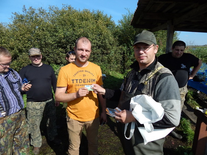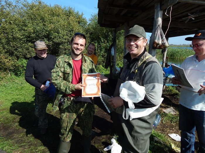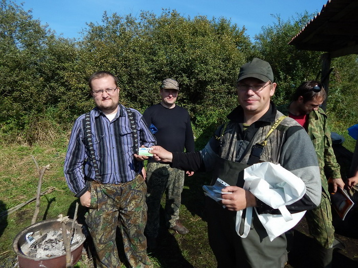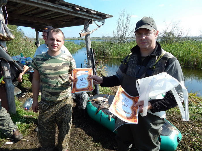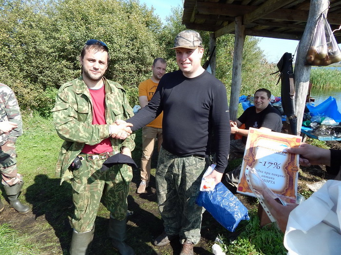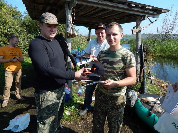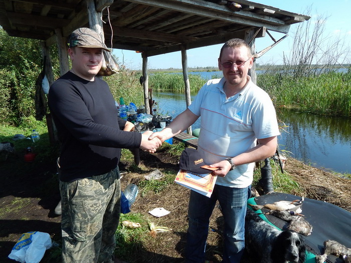 К 12.00 загоны закончились и все направились к беседке, где проходил подсчет добычи и выдача призов. Всего удалось добыть 8 уток и трое самых результативных были награждены подарками от магахина "Байкал" и конечно же призами и дисконтными картами магазина Sledopit.by