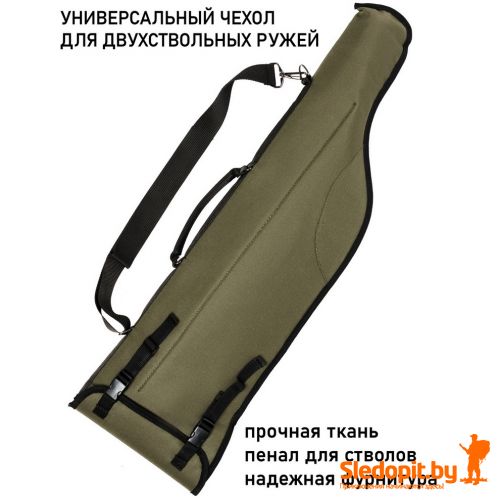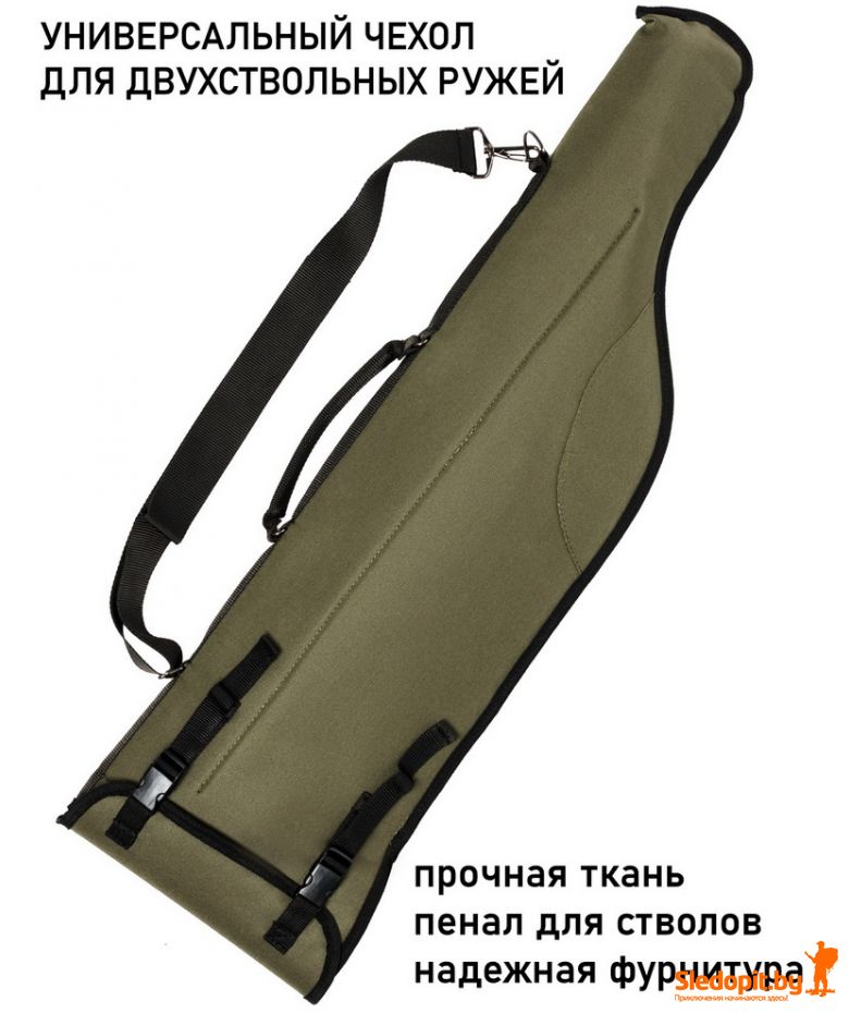 Надежный и прочный оружейный чехол для стандартного двухствольного ружья типа ИЖ-27, ИЖ-54, ТОЗ-34, ТОЗ-54, ИЖ-58 и их аналогов отечественного и импортного производства.Чехол для ружья имеет 3-х слойную структуру: прочный материал верха, прокладка из пенополиэтилена 6мм., подкладочная ткань. Чехол для оружия имеет два отделения - одно для приклада и второе для ствола. Чехол запирается регулируемым клапаном с двумя застежками, позволяющих подобрать оптимальную длину чехла под разную длину стволов, максимальная длина стволов 85см. Для переноски имеется перекидной регулируемый плечевой ремень и ручка. Чеход для ружья прекрасно подходит для того, чтобы содержать оружие в безопасности.
