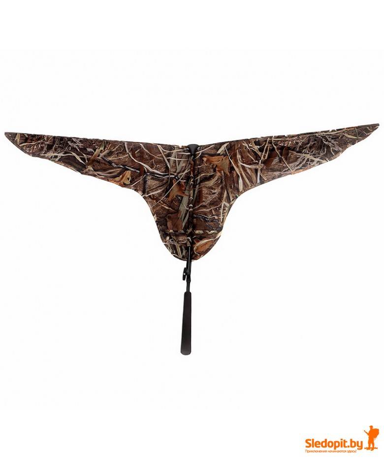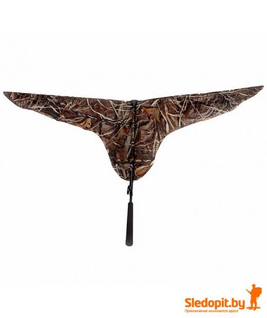Флаг для имитации подлёта гусей DUCK EXPER - это простая и эфективная приманка для охоты на гусей широко используется охотниками во всём мире. Флаг по форме похож на профиль летящего гуся. Достаточно увидев пролетающую стаю гусей помахать флагом изображая движение крыльев садящейся птицы. Это движение обязательно будет замечено пролетающей стаей. Таким образом вы привлечёте внимание стаи к своим чучелам. Одна сторона флага темная, эта расцветка сильно выделяется на фоне поля и взмахи крыльев видно очень далеко. Другая сторона выполнена в камуфляже MAX 4. Вы можете быстро перевернуть флаг и положить его на поле рядом со скрадком, сосредоточившись на работе манком и подготовке к выстрелу.