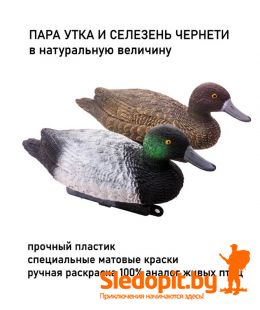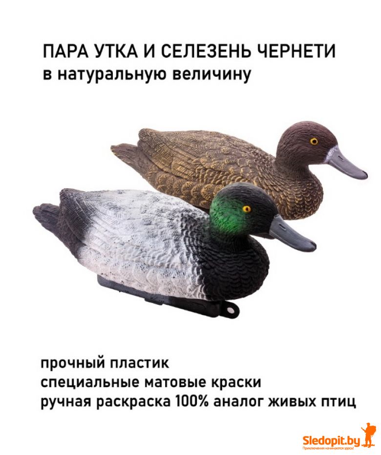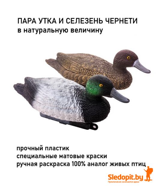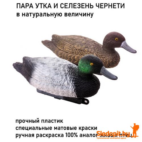 Чучело утки для охоты и декора. Комплект из двух уток: селезень и утка чернеть. Обновленная версия чучела уток Duck Expert теперь в пластике! Используя опыт и отзывы охотников изготавливаем подсадные полноразмерные несминаемые чучела чернети имеющих максимальную схожесть с живыми утками. Чучело утки кряквы окрашено антибликовыми матовыми атмосферостойкими красками. Чучело утки для охоты не гниет, не поражается грибками и плесенью и при этом каждое чучело весит всего 235г. Окрас устойчив к истиранию и при нормальной эксплуатации гарантированно держится более 5 лет. Благодаря уникальной конструкции пустотелого самозаполняющегося киля, чучела для охоты нашего производства устойчивы при любом волнении и не переворачиваются в отличии от чучел других производителей. Подсадные утки на киле имееют защип-фиксатор для установки необходимой длины якорного поводка.