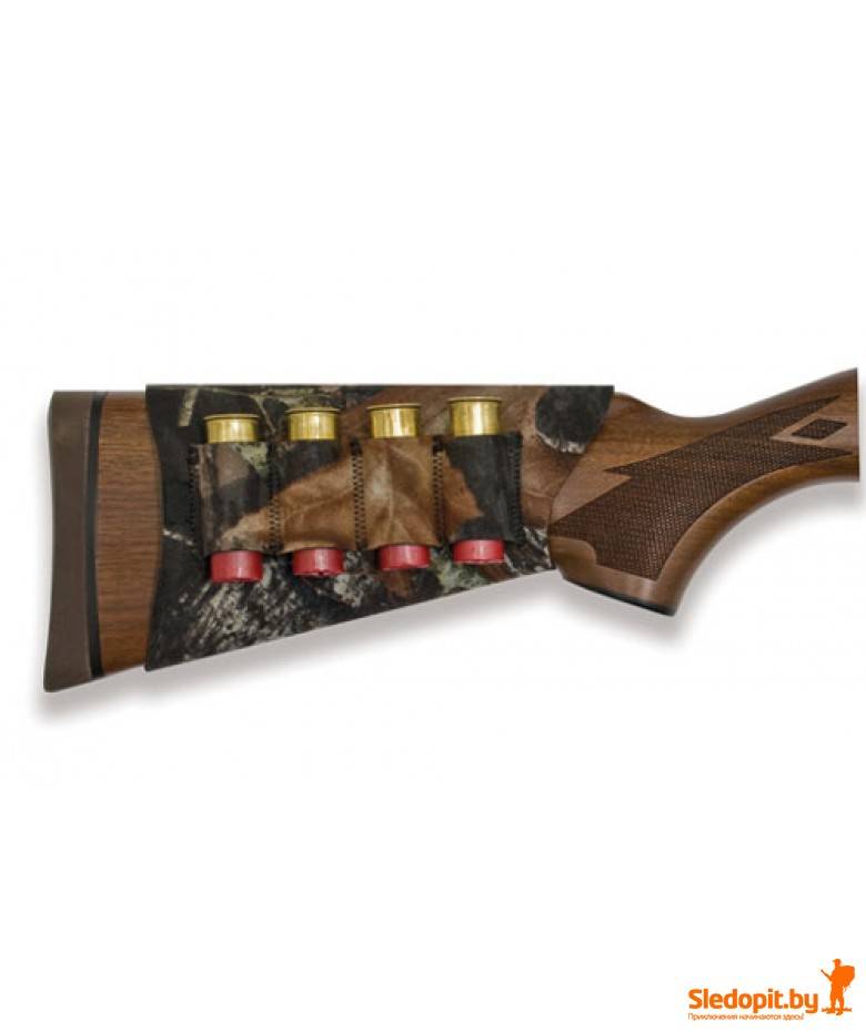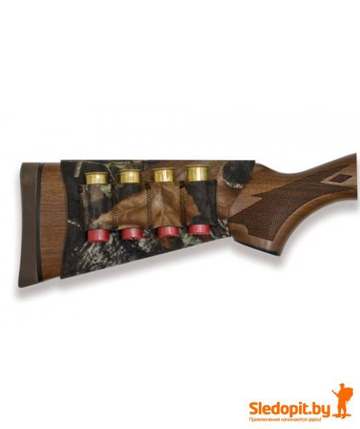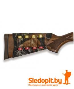 Чехол-патронташ на приклад для гладкоствольного оружия на 4 патрона изготовлен из высококачественного неопрена. Чехол-патронташ надежно и безопасно охватывает приклад оружия, дополнительно защищая его. Выполнен в камуфляжной расцветке. Чехол-патронташ застегивается с помощью липучки.