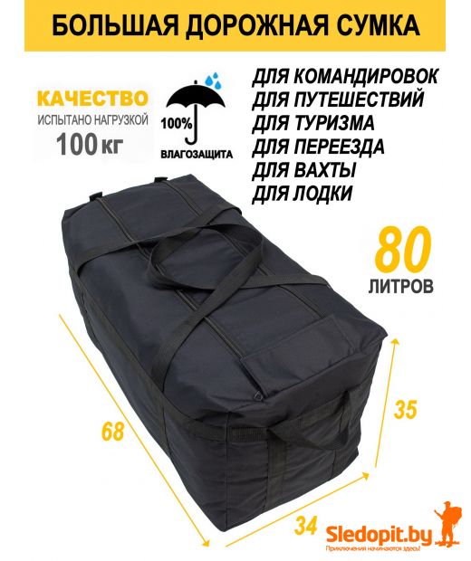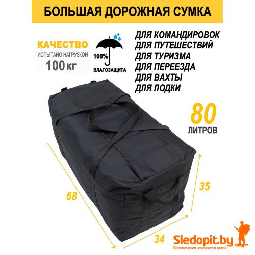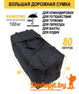 Сумка дорожная большая из очень прочного материала с влагозащитным внутренним ПВХ покрытием, легко моется и чистится. Сумка баул большая для переезда и дальних командировок, вахт. Огромная сумка туристическая на объемом 185л предназначена для транспортировки большого количества вещей в машине и лодке. Может использоваться как армейская сумка и сумка транспортная для вещей и снаряжения. Верхняя крышка закрывается двумя прочными молниями и клапаном на липучке для защиты от дождя и грязи, имеет четыре усиленные ручки две больших с боков и две с торцов для удобства переноски вдвоем, а также для удобной загрузки в машину или лодку.