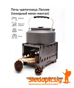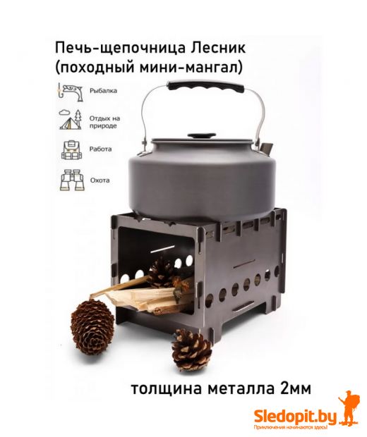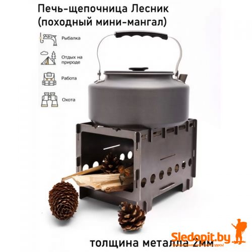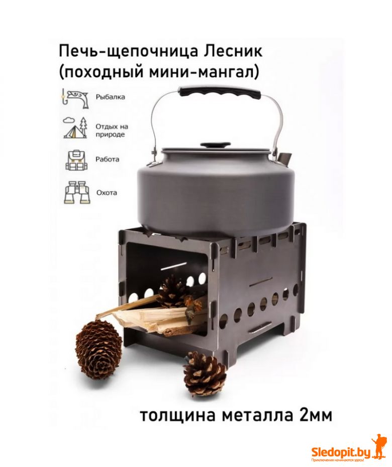 Надежная и удобная компактная печка щепочница на которой можно приготовить ужин, разогреть консерву и вскипятить чайник, при этом она неприхотлива к топливу и работает буквально на том, что лежит под ногами. В качестве топлива для этой печки-щепочницы используется практически любой горючий материал такой, который есть у Вас под ногами, к примеру шишки, веточки, щепки или сухое горючее, благодаря этому печку можно использовать в местах, где сложно найти дрова или их недостаточно. Конструкция мини печки проста, как все гениальное - пять пластин-стенок и несколько перемычек. Корпус металл 2мм с двойным дном и отверстиями в нижней части закрывает пламя от ветра и создает хорошую тягу. В результате готовить можно быстро и экономично. В разобранном виде печка занимает минимум места 19х13х1.5см, в собранном виде 19х13х13см весит с чехлом 1090г, при этом не нужно нести газовые баллоны или жидкое топливо.
